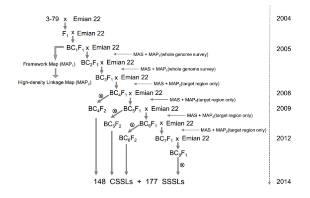 著絲粒區域鑒定:blastn,SPSS software (version 17.0)?;基因組共線性分析:MUMmer (version 3.23),GATK(version 3.1.1),Samtools(version 0.1.19)?,MCScanX package;結構變異檢測:MUMmer3 (version 3.23);二倍體棉重測序SNPs鑒定:Trimmomatic (version 0.32),BWA;168個CSSLs群體SNPs鑒定:染色體片段置換系(CSSLs)的構建(圖1),測序深度(6X),插入片段:350 bp,BWA,GATK和Samtools;CSSLs群體QTLs定位與表達分析:QTL IciMapping (version 4.0)?;TopHat2 (version 2.0.13)?;Cufflinks (version 2.2.1);STRUCTURE (version 2.3)?;TASSEL software (version 5.0)?;