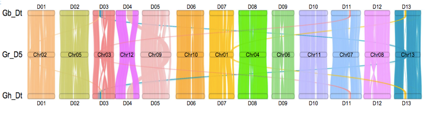 四倍體陸地棉和海島棉基因組的組裝使得研究人員能夠進一步探索四倍體棉亞基因組和其二倍體祖先之間的基因組差異。首先通過對具有D型基因組的13份二倍體材料進行重測序分析,分析顯示在兩種四倍體棉D-亞基因組具有相同的二倍體祖先種雷蒙德氏棉G. raimondii(D5 genome,D亞基因組供體);進而利用二倍體雷蒙德氏棉G. raimondii直接進行基因組比較分析,發現四倍體陸地棉和海島棉與雷蒙德氏棉相比,都有一些獨特的結構變異,如在海島棉染色體D05和陸地棉D12中均存在大的染色體臂間倒位,暗示這些變異出現在多倍化之后(圖5)。研究人員還觀察到兩個四倍體相對于G. raimondii共有一些結構變異,例如染色體D09中兩個四倍體發生了大的反轉(圖5)。研究中同時運用了二倍體祖先種亞洲棉G. arboreum(A2 genome,A亞基因組供體)的Hi-C數據,與陸地棉和海島棉A亞基因組進行比對,檢測棉由二倍體到四倍體多倍化過程中發生的結構變異,Hi-C具體矩陣圖顯示在13條染色體中發生了大規模的染色體重排,其中發部分變異為兩個四倍體的棉的A亞基因組共有。研究中發現染色體A06中*大的染色體臂間倒位(in2)在陸地棉中是特有的(圖3?左),表明這種結構變異可能在染色體多倍化后發生。因此得出結論,二倍體棉花中的A基因組在異源多倍化后被重組,導致不同四倍體(陸地棉和海島棉)中發生了大染色體倒位。