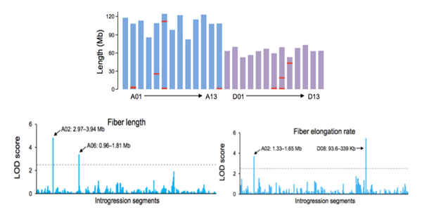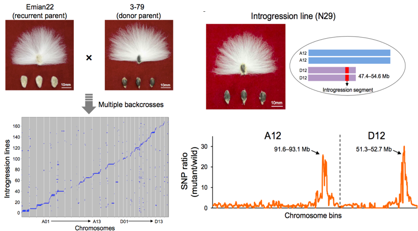 通過研究發現了在陸地棉(G.?hirsutum?acc. TM-1)和海島棉(G. barbadense?acc. 3-79)間存在廣泛的遺傳變異,進一步推測這些變異的一部分可能是造成表型差異的原因,包括纖維性狀。為了利用這些變異進行定向育種,研究人員構建了一個漸滲系群體,旨在引入有利的變異,控制從G.barbadense到G. hirsutum等重要農藝性狀的形成,如纖維質量。研究人員通過分子標記對168份漸滲系材料進行測序,并鑒定了涵蓋所有26條染色體的466個基因滲入片段(圖6)。研究人員發現了在染色體D12中含有漸滲片段的漸滲系,其具有有限的絨毛纖維,類似于其供體親本G.barbadense?3-79(圖6,圖7上),基因滲入片段的位置與無絨天然突變體G. hirsutum?Xuzhou142fl的圖譜測序所示的位置相同,然而其遺傳基礎以前未被充分了解(圖7下)。這些結果表明,陸地棉(G. hirsutum)中無絨毛突變體的遺傳變異與海島棉(G. barbadense)中的數量性狀基因座(QTL)共定位。該漸滲片段與天然纖維突變體的特征將有助于比較分析海島棉和陸地棉之間的絨毛纖維起始機制。