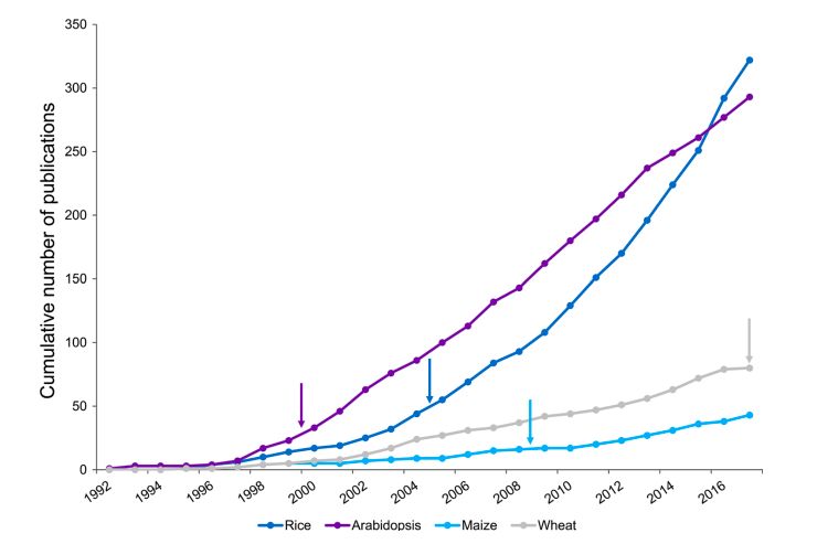 ATCG不規則的排列組合組成了地球上近870萬個物種形形色色的遺傳物質,而解密其內在調控機制是生物工作者心心念念奮斗的目標。1977年,噬菌體ΦX174長達5375-bp基因組被測序完成,基因組測序事業開始蓬勃發展,時至今日,NCBI收錄了超過6000個真核生物和150,000個原核生物的測序數據,其中包括禾本科。而基因組研究目的也從單純的科學研究向實踐應用發生著轉換。基因組學和生物技術相結合,包括標記輔助選擇,基因組選擇和基因編輯,已成為育種中不可缺少的工具,功能基因的定位和克隆將會把這種技術的結合作用發揮更大。