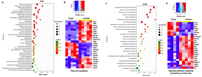 與其它高原哺乳動物不同,喜馬拉雅旱獺在冬季冬眠。為了闡述旱獺冬眠的分子機制,研究人員分析了來自喜馬拉雅旱獺肝臟和大腦的RNA-seq數據,以表征在冬眠/覺醒周期中基因表達的變化。差異表達的基因(DEGs)顯著富集在肝臟中脂肪酸代謝,萜類骨架生物合成和初級膽汁酸生物合成的途徑(圖3 A)。并清楚地觀察到在冬眠狀態下,參與脂肪酸降解的基因的上調及參與脂肪酸合成的基因的下調,暗示了一個√確的脂質代謝調節機制(圖3 B)。此外,還發現在覺醒狀態下,包含與藥物代謝相關的基因-細胞色素P450,氨基酸的生物合成和碳水化合物分解代謝相關基因的總體下調。