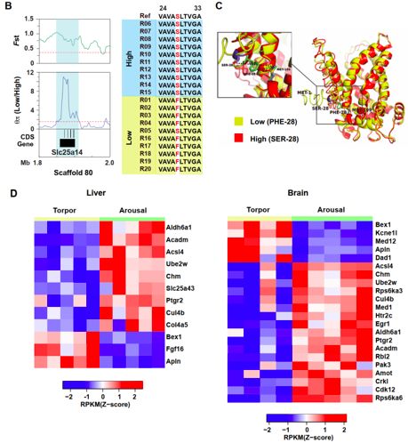 為了更好地了解喜馬拉雅旱獺的高原適應性機制,研究人員從極高海拔(海拔> 4,500 m,n = 10)和相對低海拔(<1,900 m,n = 10)收集了20只喜馬拉雅旱獺。研究人員首先測量了血液參數,發現與低海拔喜馬拉雅旱獺相比,高海拔喜馬拉雅旱獺的一些血液相關性狀,尤其是紅細胞計數,血紅蛋白濃度和平均紅細胞體積顯著增加。接下來,對每個喜馬拉雅旱獺進行了全基因組測序,并在喜馬拉雅旱獺基因組中搜索了具有高種群分化(Fst)和多樣性比率(qp,low/qp, high)的區域,最終鑒定了分布在喜馬拉雅土撥鼠基因組不同scaffolds?中的24.84 Mb受選擇的區域。這些區域含有383個功能基因,與非選擇性基因相比,這些基因具有更高的Ka / Ks值(P <0.01),主要功能類別包括“缺氧反應”,“DNA修復”,“血管生成”,“心臟功能”,“脂肪酸代謝”,“細胞周期”,“發熱”和“鈣信號通路”。參與缺氧誘導因子-1(HIF-1),血管內皮生長因子(VEGF)或其它缺氧相關信號通路的10個功能基因,包括Slc25a14,Nox-1,Hmox1,Vegfr2,Atg16l2,Bex1,Ptgr2,Gprasp1,Fam46d?和Chd3,在高海拔和低海拔群體之間顯示出明顯的基因分型差異(圖4 A)。在Slc25a14中發現了非同義替換(由Ser28取代Phe28,F28S),其顯示出*強的分化信號(FST = 0.73)(圖4 A和B)。基于同源建模的Slc25a14的三維結構顯示,F28S替換發生在N末端的loop區域,并且由于氨基的電荷和極性的變化而增加其與相鄰的α-螺旋的距離(圖4 C)。為了進一步評估這一變體的功能影響,研究人員將突變體Slc25a14與其在不同哺乳動物中的直系同源基因進行比對,并發現Phe28在比對的其它動物中高度保守。該突變體功能影響的預測證明F28S取代是有害的,所有這些結果都表明F28S突變可能是高海拔群體Slc25a14選擇性清除的結果。為了推測旱獺高海拔適應和冬眠的遺傳適應性機制,研究人員在選擇性清除區域鑒定到了116個差異表達基因,在這些基因中,25個差異表達基因與HIF-1途徑相關,主要屬于DNA修復,血管生成,脂肪酸代謝,細胞凋亡/細胞周期和發熱的類別相關。在冬眠/覺醒周期中,大量選擇性清除基因具有差異表達,表明這兩種生物學過程之間存在共同的遺傳影響(圖4 D)。在這些基因中,Bex1, Apln, kcne1l, Med12, Dad1和Fgf16在冬眠階段肝臟或腦中顯著上調(圖4 D),進一步證明這些基因參與冬眠和高原適應性,先前的研究報道了這些基因參與許多生理過程,包括神經元分化,肝再生,血管生成和能量代謝,而這需要進一步的實驗驗證。