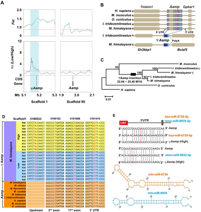 假基因逐漸被認定為是適應性表型多樣化的重要調節因子,與選擇性清除信號相關,研究人員鑒定了27個參與極高海拔適應的候選假基因,占全基因組范圍內假基因的1.83%。這一比率幾乎與具有1.78%的功能基因的比率相當,表明它們在極端環境的適應性中的作用不可忽略。與蛋白質編碼基因中發現的群體基因型差異一致,研究人員在高海拔群體中觀察到受選擇的假基因中幾乎固定的突變,例如ΨAamp,ΨAdl1和ΨRnf114。在這些假基因中,血管相關的遷移細胞蛋白假基因(ΨAamp)具有完整的基因結構并顯示出*高的Fst值(Fst = 0.67),但ΨAamp未被檢測為受選擇性基因(圖4 A和5 A)。ΨAamp的結構顯示它是一個整合的加工假基因,其mRNA通過逆轉錄被插入基因組中(圖5 B)。這個假基因含有過早終止密碼子(第208個核苷酸,C> T),缺失/插入和移碼突變,使其不能翻譯成功能性的蛋白,Aamp和ΨAamp的共線性分析表明在不同哺乳動物中Aamp是高度保守的。然而,在地松鼠和喜馬拉雅旱獺中發現并保存了高度保守的共線性位點(圖5 B),進一步的系統發育分析表明,ΨAamp和Aamp屬于兩個獨立的分支,基于序列分歧插入時間的估算暗示假基因的插入事件發生在約22.64~25.40 MYA,在喜馬拉雅旱獺和地松鼠分化之前(圖?5 C)。這些發現支持古老的假基因對于松鼠具有特異性并從共同的祖先遺傳而來這一假設,然而,與地松鼠相比,喜馬拉雅旱獺顯示Aamp和ΨAamp之間的序列距離較小,這表明存在選擇性壓力來維持旱獺的遺傳元素。