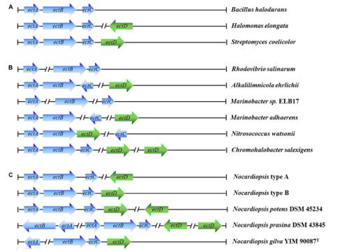 擬諾卡氏菌種是從鹽湖或堿性環境中分離出來的,其中有約三分之二的菌種嗜鹽或耐鹽。在高鹽環境下,擬諾卡氏菌可通過加固細胞壁和積累滲透因子等多種方式而使自身得以生存。鹽刺激條件下,滲透因子的累積可使得菌體在不影響其基本細胞進程和常規代謝的情況下而保持菌體滲透平衡。其中在自然界含量最多的滲透因子便是四氫嘧啶,其可促進蛋白折疊,并保護酶、核酸、抗體等生物分子,使細胞可應對多種壓力環境。在所有的擬諾卡氏菌種中都有參與四氫嘧啶合成的相關基因。