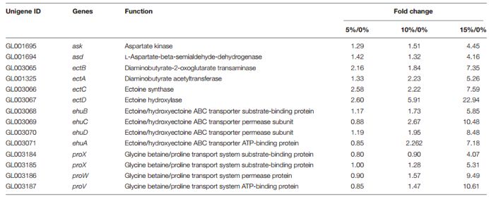 對菌種進行二代測序,篩選FDR<0.01,Fold Change≥2的基因為差異表達基因,并使用COG、GO、KEGG、Swissport和NR數據庫進行注釋分析。通過COG分類,共獲得25個COG組別,其中氨基酸轉運和代謝、碳水化合物轉運和代謝是其主要組分。DEGs被分布在34個GO term里,其中包括細胞組分、分子功能和生物過程三大類。與此同時,三個比較組(5%/0%, 10%/0%和15%/0%)差異表達基因分別富集到77、32和90條KEGG通路中,其中ABC轉運受體,甘氨酸、絲氨酸和蘇氨酸代謝在鹽刺激下扮演相當重要的角色。尤其在最大耐受度的NaCl鹽環境里,參與ABC轉運受體通路的四氫嘧啶和羥基四氫嘧啶基因、甜菜堿基因和四氫嘧啶和羥基四氫嘧啶合成基因表達量都顯著提高。