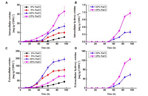 將重組質粒轉入大腸桿菌中,發現在15%的NaCl緩沖液中,四氫嘧啶很難產生,并在0%的緩沖液中檢測到少量四氫嘧啶。在10%和15%的鹽濃度環境下,四氫嘧啶的合成速率分別在24h和48h中顯著下降,其最大合成速率為[0.5 mg (g CDW)?1?h?1],而最終產出[28.85 mg (g CDW)?1]?。