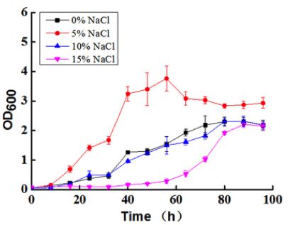 隨著鹽濃度的增高,菌落顏色由黃色變為白色,且在5%的NaCl鹽溶液中生長最佳,鹽濃度高于或低于該濃度,其生長速度均會下降。
