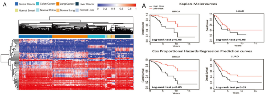 從TCGA中常見癌癥(肺癌、乳腺癌、結腸癌、肝癌)的甲基化數據中篩選癌癥標記物,這些標記物能非常準確的(準確度95%)區分開癌組織和正常組織。同時他們發現DNA甲基化模式可以預測預后和生存。