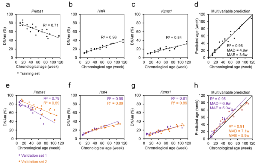 該研究從上述研究及其他研究中的基礎上選擇了9個甲基化區域在不同年齡段的小鼠血液樣品中進行焦磷酸測序,建立年齡預測的模型,最后選擇了3個CpG位點(Prima 1, Hsf4, Kcns 1)來預測小鼠的年齡和壽命。