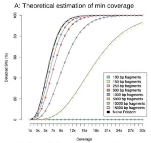 根據兩個人類數據集的錯誤情況和read長度,作者對兩條人的染色體模擬了50X?Pacbio?和ONT?read 。純粹的統計分析發現,近10X覆蓋度的數據(平均長度10kb)就足夠去推斷所有SV斷點(一瞬間覺得自己可以省好多錢有木有),然而對于100bp的短read雙端測序至少要25X覆蓋度。當前這個統計只是一個理想情況,比如缺乏了重復和覆蓋度的偏移,因此是低估了所需的覆蓋度的。