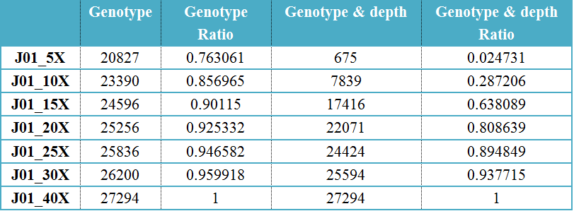 注:Genotype列代表不同深度下識別出的和40X SV基因型相同的SV個數,Genotype ratio為SV占40X SV的比例。?Genotype & depth 為與40X SV基因型相同且read支持數大于10的SV個數,Genotype & depth Ratio為基因型相同且read支持數大于10的SV比例。
