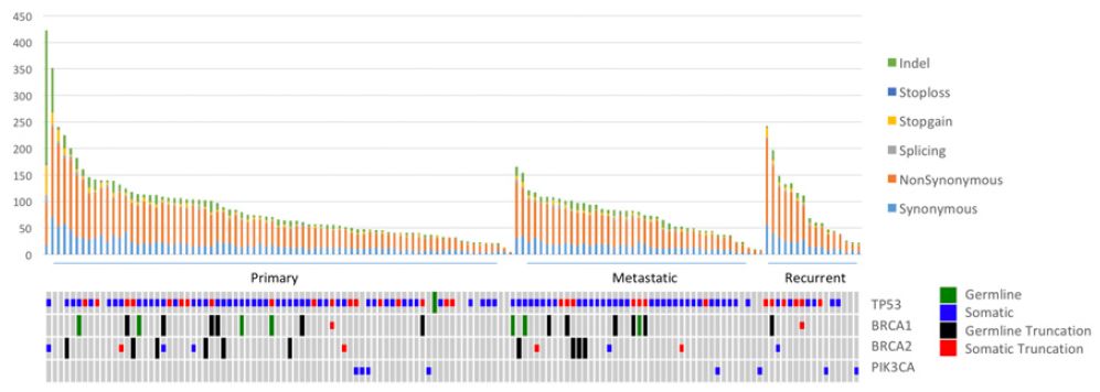1、研究者通過全外顯子組測序(WES)分析了來自77名單側卵巢癌患者的122例新鮮凍存腫瘤組織(64個原發灶,41個轉移灶和17個復發灶,其中原發灶中含有分別與轉移灶和復發灶相匹配的樣本)以及匹配的正常DNA(來自靜脈血等)的突變情況。