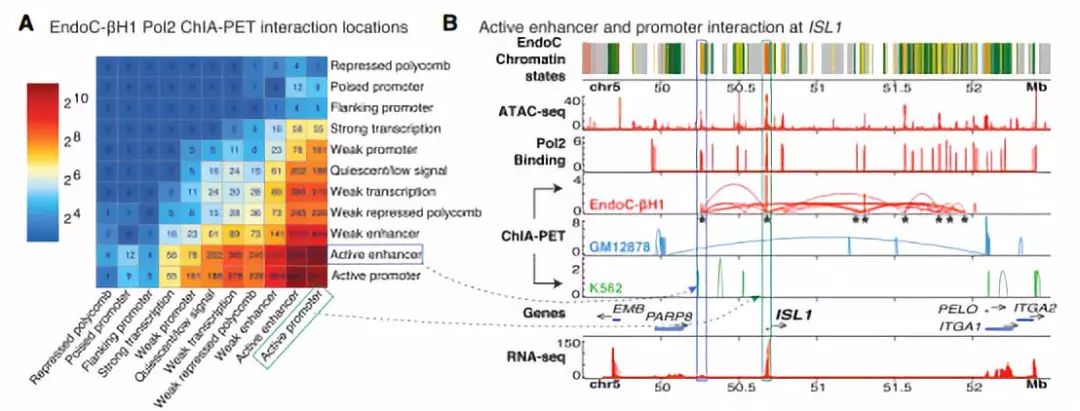 EndoC-βH1作為一種細胞模型,用于研究β細胞功能和糖尿病的遺傳和環境病因。但對該模型,缺乏對其分子景觀的全面了解。文中,作者報道了EndoC-βH1的染色體(光譜核型分析)、遺傳(基因分型)、表觀基因組(ChIP-seq和ATAC-seq)、染色質相互作用(Hi-C和Pol2 ChIA-PET)和轉錄組(RNA-seq和miRNA-seq) 的圖譜。對這些圖譜的分析定義了β細胞中已知(如PDX1和ISL1)和推定的(如PCSK1和mir-375)特異性順式轉錄調節網絡,并鑒定了等位基因對順式調節元件的影響。