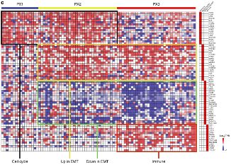 該研究共鑒定到11340個不同的基因產物,覆蓋了腫瘤細胞及腫瘤微環境所有可能表達的蛋白。研究人員對胃癌與癌旁組織全蛋白表達譜進行聚類分析,將彌漫型胃癌分為三個分子亞型(PX1~3),且這三個亞型與生存預后和化療敏感性密切相關。這是世界上實現在蛋白層面上對腫瘤進行分子分型,且分的的亞型與預后和化療有顯著性關聯。其中PX1型(細胞周期型),總生存時間最長;PX2型 (上皮-間充質轉化型),生存預后介于PX1和PX3之間;PX3 (免疫通路富集型)患者腫瘤組織高表達蛋白富集在免疫響應相關通路和EMT相關蛋白上,總生存時間最短,并且該組患者對化療不敏感。