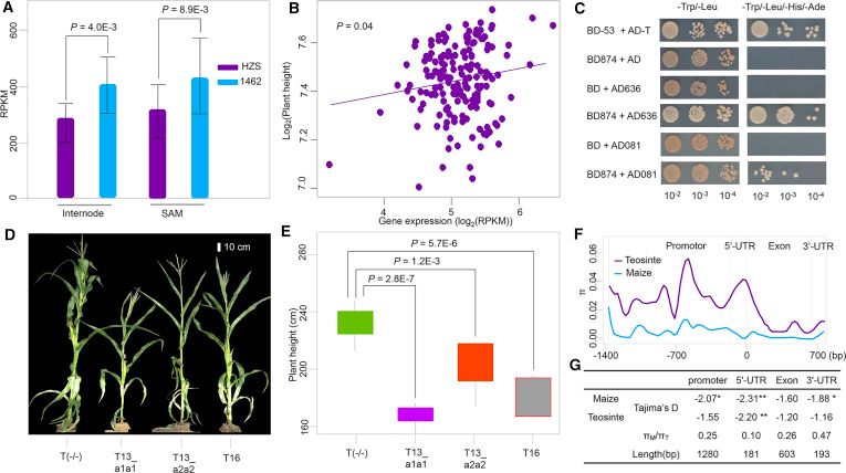 為進一步確定候選基因,本研究又通過RNA-seq分析發現,Zm00001d020874表達量在雙親的莖頂端分生組織(SAM)與幼嫩節間組織中存在顯著性差異。基于擬南芥同源蛋白功能與smoothLOD定位信號,認為Zm00001d020874是qPH7的候選基因,并且后續的CRISPR基因敲除,蛋白互作驗證等實驗均暗示Zm00001d020874是控制株高的基因。