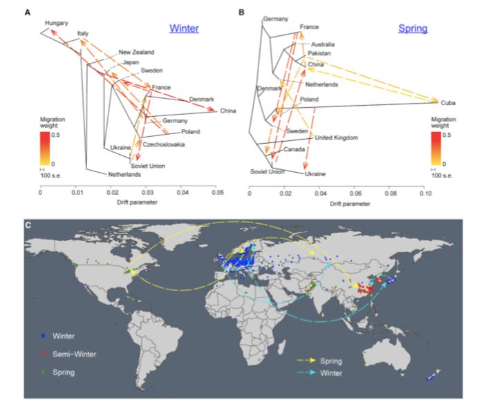 進一步計算世界地圖上顯著的基因流數目之后,在冬型和春型油菜中發現了四個主要基因流(圖2C)。冬型油菜的基因流從法國到俄羅斯(weight=0.5)、法國到瑞典(weight==0.3)、波蘭到日本(weight==0.3)和日本到中國(weight==0.3),而春型油菜的基因流從法國到俄羅斯(weight==0.5)、法國到瑞典。經德國(weight=0.4),瑞典到加拿大(weight=0.2),加拿大到中國(weight=0.5)。沒有顯著的生態型漂移事件(inter-ecotype drift events)(圖2 A、B)。