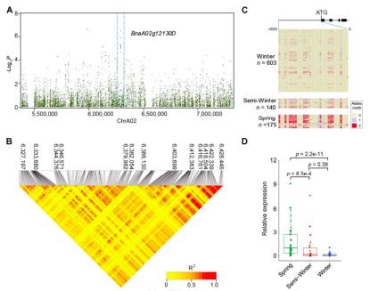 在春與冬、春與半冬、半冬與冬的選擇性清除分析下,推測有12~15個乙烯基因。在Chr.A02上僅推測ERF119直系以及Chr.A10上推測的AP2-like ERF (AIL6)直系顯示與生態型差異相對應的有區別的SNPs。這些生態型特異性SNPs與已發表的轉錄組數據中的ERF119和AP2-like ERF(AIL6)的轉錄水平相關,這使三種生態型表現出不同的營養生長期。