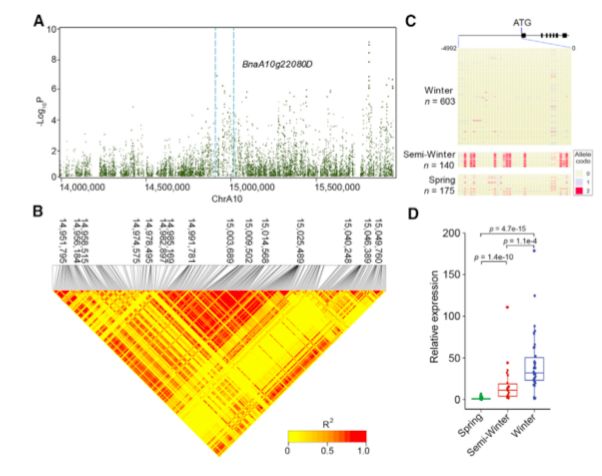 BnaA10g22080D是擬南芥FLC的一個假定的同源基因,在Chr.A10的14.99-15.01 Mb之間的區域內被鑒定(圖3B)。GWAS和LD分析表明,BnaA10g22080D的5’調控區的SNPs與品種間開花時間的變化顯著相關(圖6A和6B)。