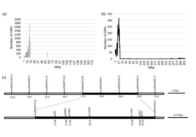 圖3. 混池間SNPs分布(a. BSA-seq與b. BSR-seq)及pc1區域物理圖譜(c.)