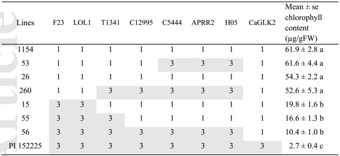 為進一步精細定位pc1,本研究對624個F2(1154 × NIL 86-45)單株標記分型以篩選QTL區域內的交換單株。基于前期研究,標記T1341與QTL peak連鎖最為緊密 (Brand et al., 2012),作者又在T1341附近開發出6個標記,在標記F23與H05間,共篩選出34個F4交換單株,可代表6種基因型組合,橫跨Chr.1:5cM的區間。為排除pc1與pc10互作的影響,作者將所有交換單株的CaGLK2固定為1154等位基因。結果分析暗示,F23與LOL1是與QTL連鎖最為緊密的標記,因為line 15含PI 152225最短的導入片段且葉綠素含量顯著低于1154,而line 260在這2個標記間含1154等位且與1154葉綠素含量沒有顯著性差異。此外,lines 53與260在APRR2-like位點含有PI 152225等位,葉綠素含量卻與1154沒有顯著差異,暗示此基因(APRR2)在本研究中的遺傳背景下不影響葉綠素含量(表1.)。