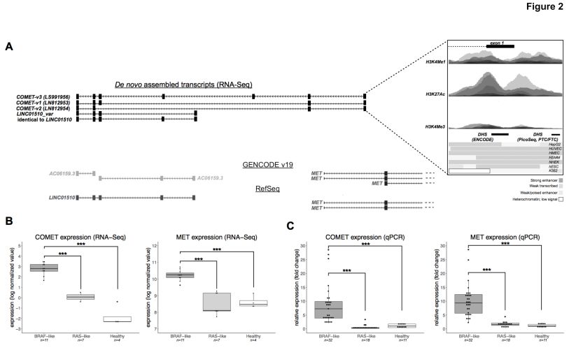 為了探索PTC中BRAF和RAS樣特異性lncRNA模式,首先在最近發表的來自22個甲狀腺活組織的RNA-Seq數據集中建立了從頭轉錄組裝的計算工作流程,定義一個新的PTC模型轉錄組。大于200nt低編碼潛能且與已注釋基因位點無重疊的轉錄本鑒定出454個新的lncRNA。與蛋白質編碼基因類似,已知和新發現的lncRNA在患者和對照之間具有顯著差異的表達水平(FDR <0.05)。202個lncRNAs的表達在BRAF和RAS樣PTC之間存在顯著差異(其中77個在BRAF樣PTC中過表達,125個低表達),其中60個未在公共數據庫中注釋(圖1D和1E;FDR <0.05)。因此,為鑒定尚未注釋的lncRNAs :i)在PTC中異常表達,ii)在BRAF-和RAS樣亞組之間差異表達,iii)在附近定位和iv)與已知癌癥驅動基因高度相關,作者使用“最近轉錄起始位點”(TSS)方法選擇mRNAs / lncRNAs對。有趣的是,基于這些標準,將COMET(COrrelated-to-MET)鑒定為新的lncRNA,與MET癌基因正相關(r = 0.7)。