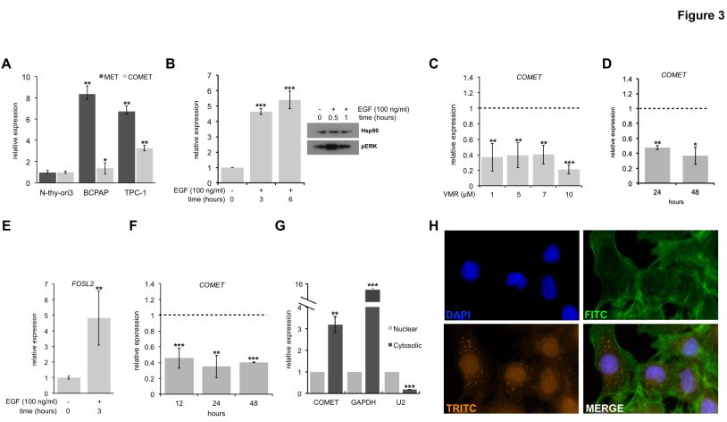 BRAF樣PTC的特征在于ERK介導的轉錄程序的過度激活。這一點促使研究COMET表達是否在MAPK激活下游被誘導。因此,用表皮生長因子(EGF)刺激Nthy-ori 3-1細胞中的RAS-RAF-MEK-ERK途徑。MAPK途徑的誘導 – 通過早期p-Erk增加證實(圖3B,右圖) – 隨后COMET水平顯著增加(圖3B,左圖)。相反,使用化學和遺傳方法抑制BRAF突變的BCPAP細胞系中的組成型活性途徑,通過用vemurafenib阻斷過度活化的B-Raf蛋白(圖3C)或BRAF基因KD(圖3D),顯著降低COMET水平。之后評估了COMET細胞定位,與qPCR偶聯的RNA分級分析顯示,與內參蛋白質編碼基因(GAPDH)類似,COMET在細胞質RNA部分中具有明顯富集(圖3G)。此外,RNA FISH進一步證實了這種新的NAT lncRNA的細胞質定位(圖3H)。