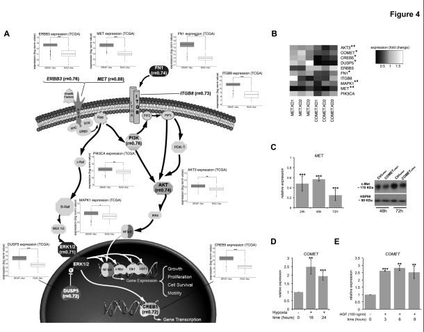 為了預測COMET的功能并確定其在乳頭狀甲狀腺癌中的潛在生物學意義,基于共犯原則進行分析。利用基于TCGA的lncRNA圖譜TANRIC,使用Pearson相關性評估甲狀腺癌樣本中的COMET表達是否與其他基因的表達相關。與初步發現一致,用鄰近癌基因MET檢測出最高相關值(r = 0.88)。此外,對與COMET顯著相關(FDR <0.05;r≥0.7)的基因進行的通路分析顯示MAPK通路的富集,并且有趣的是,其中一些在來自TCGA的PTC樣品的BRAF樣群中過表達( 圖4A)。