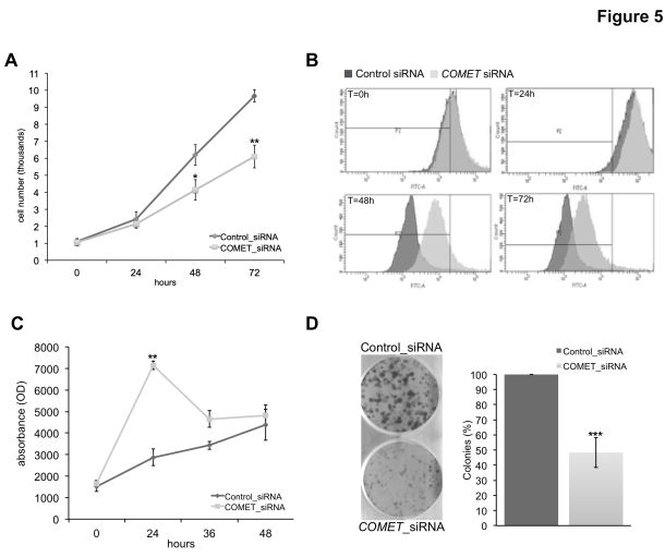 由于COMET KD引起c-Met水平的相關下降,以及甲狀腺癌細胞中其他MAPK相關癌基因表達水平的顯著降低,進一步研究了COMET KD對腫瘤細胞的表型效應。為此在不同時間點測量了COMET KD后TPC-1細胞系的細胞活力和增殖能力。有趣的是,與對照無關轉染的細胞相比,COMET-KD活細胞的百分比顯著降低至~40%(在72小時)(圖5A)。通過細胞增殖測定檢測COMET-KD顯著降低細胞增殖(圖5B)。此外,為了進一步了解COMET如何調節甲狀腺癌細胞的細胞生長,通過測量半胱天冬酶3和7的活性驗證了COMET KD是否能夠誘導細胞凋亡。如圖5C所示,沉默24小時后COMET KD顯著增加凋亡TPC的數量 。最后,為了驗證COMET KD是否在體外影響甲狀腺腫瘤細胞的致瘤潛力,檢測了COMET-KD TPC-1和對照細胞的克隆形成能力。如圖5D所示,在菌落的數量和大小方面,COMET沉默顯著影響甲狀腺癌細胞的致癌能力。