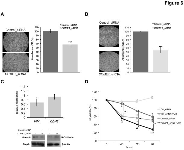 據報道,受體酪氨酸激酶(RTK),特別是c-Met受體的激活是腫瘤細胞逃避vemurafenib(VMR,維莫非尼)介導的突變體B-Raf蛋白抑制的機制。由于作者數據支持COMET可作為MET新的調節劑,猜測它是否也可能作用于BRAF突變的腫瘤細胞中的vemurafenib反應機制。首先,與TPC-1細胞類似,評估COMET沉默對BRAFV600E突變的BCPAP細胞系的生存力(高達50%)具有強烈影響(圖6D),伴隨MET水平的下降。當用VMR處理BCPAP時,也表現出了類似的效果(高達60%的細胞存活率降低)。因此,將敲低COMET的BCPAP細胞暴露于VMR,以評估組合治療是否可發揮累加效應。有趣的是,圖6D中數據表明,與對照細胞(即僅用VMR處理和/或用對照siRNA轉染的細胞,圖6D)相比,COMET敲低的 BCPAP細胞具有顯著增強的VMR敏感性,表明在BRAFV600E突變腫瘤中COMET是提高化療的新靶標。