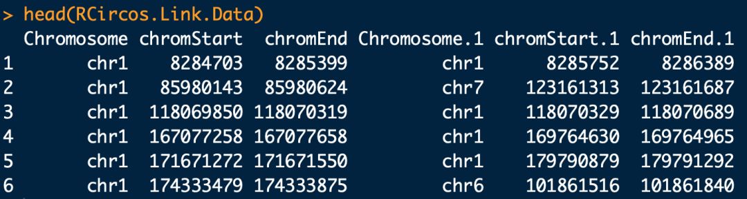 #?數據內容如上圖,第一列?染色體編號;第二列?聯系位點在染色體片段的起始位點;第三列?聯系位點在染色體片段的結束位點;第四列?聯系位點在所在的另一個染色體編號;第五列?聯系位點在所在的另一個染色體片段的起始位點;第六列?聯系位點在所在的另一個染色體片段的結束位點