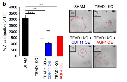 作者通過ATAC-seq和轉錄組測序數據篩選出來TEAD1的候選靶基因,并進一步利用ChIP-PCR,驗證了與TEAD1結合的靶基因–AQP4、EGFR和CDH4。TEAD1敲除使AQP4下調,TEAD1過表達可恢復AQP4的表達,而TEAD1和AQP4過表達均可修復TEAD1KO細胞的遷移缺陷,說明TEAD1作用于靶基因AQP4,調控其表達,進而參與GBM遷移的直接調控機制。
