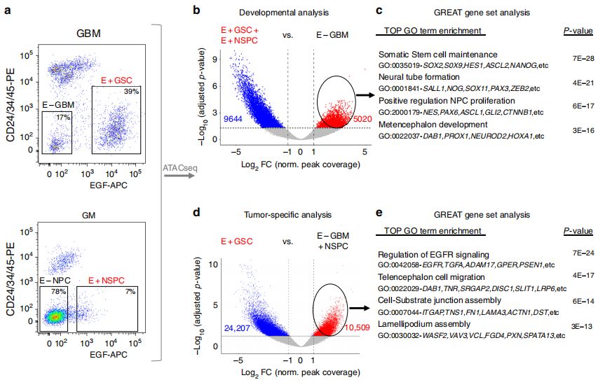 在此,作者從人GBM和生發層(GM)組織中直接分離出GSC和神經干細胞/祖細胞(NSPC),基于ATAC-seq研究在相似的發育背景下腫瘤發生的內在轉錄調控因子及其調控機制。