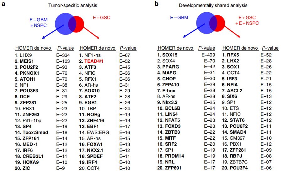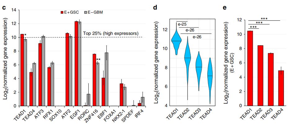通過ATAC-seq分析染色質的可及性,不僅可以識別轉錄的調控區域,還可以推斷出其中的TF活性。在此,作者鑒定了27個GSC腫瘤特異性的TF motif,26個在E+GSC和E+NSPC中共有的發育相關TF motif。其中,TEAD1/4是具有很高活性的TF( motif是GSC特有peak中顯著富集,且基因表達水平高),其它候選TF包括ATF3、RFX1、FOXA1等。而E+GSC和E+NSPC中共有的發育相關TF包括SOX1、IRF3、NFIA等。然后,作者利用以前的類似的E+/E-GBM的RNA-seq數據,考慮到腫瘤特異性TF的基因表達水平,其中只有TEAD1在E+GSC中差異過表達。