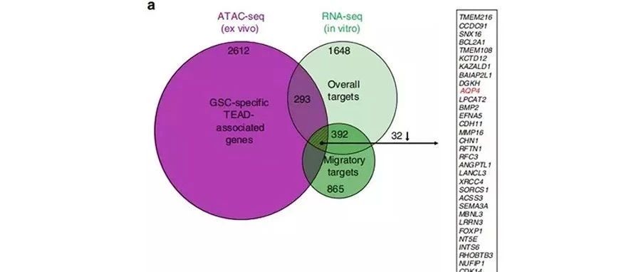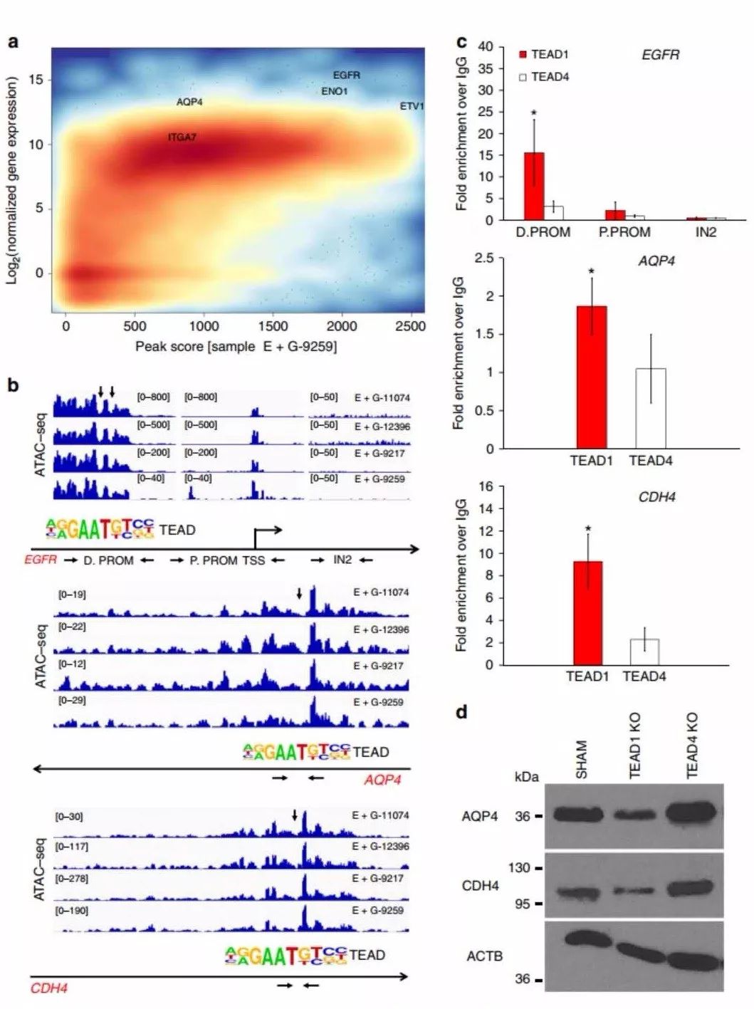 GSC中TEAD1可接近區域peak(ATAC-seq)和基因表達水平(RNA-seq)的一致性分析,結合GBM中TEAD1與基因共表達(TCGA中的GBM RNA-seq數據)分析,發現TEAD1的靶基因包括EGFR、AQP4、CDH4、TNC等多個候選靶基因。