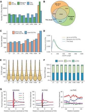 本文共鑒定到16,325個唯一的3’UTR轉錄本,在每個階段均鑒定到超過10,000 個3’UTRs。將鑒定到的3’?UTR與已知數據庫進行比對,發現共有82.9% UTRs的重疊。此外,還鑒定到2,304個新的發現的3’?UTR。3’?UTR的長度會隨著階段的延續,從L1到L4,逐漸變短,在成年線蟲中,雄性線蟲的3’?UTR要短于雌雄同體的成蟲,而成蟲的 3’?UTR要稍長于L4階段的成蟲,這與前人的報道相反。通過不同階段多聚腺苷酸化位點統計,發現在不同階段,其位點不存在顯著差異,該結果表明,不同階段3’?UTR的長度分布與多聚腺苷化位點無關。
