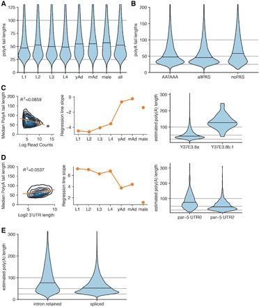 PolyA的長度,有可能和3’?UTR區域的polyA剪接位點(AAUAAA)有關。為了證明該推測,本文對不同polyA剪接位點類型(經典的、可變的及無剪接位點)的polyA尾進行了長度統計,發現不同類型間存在顯著差異,且3’UTR區域不存在polyA剪接位點的,具有更長的polyA尾巴。在3’UTR區域,無polyA剪接位點的,其polyA長度中位數為58 nt,具有可變polyA剪接位點的,長度為46 nt;具有經典的polyA剪接位點(AAUAAA),其長度中位數為48 nt。研究表明,polyA尾的長度與基因表達呈現負相關,即高表達的基因具有更短的polyA尾。對本研究數據進行統計發現,在幼蟲發育階段發現有相似的負相關關系。例如,Y37E3.8基因的a轉錄本的表達要顯著高于b.1轉錄本,其polyA尾相較于b.1更短。polyA長度和基因表達水平的相關性R2?最高為0.1297。在成蟲發育階段,polyA長度和基因表達水平的相關性并不是很高。該結果表明,基因表達水平和polyA尾長度的負相關性具有階段性。最后,本文研究了polyA長度與內含子保留可變剪接事件的相關性。研究表明,在人類細胞系中,polyA尾的長度與內含子保留有關。在本文中,也發現polyA尾和內含子保留事件呈現正相關。該結果表明,polyA尾在轉錄后調控存在一種保守機制,即在核轉錄本中,其擁有更長的polyA尾,而隨著轉移到內質網的過程中,polyA尾會進行脫腺苷化而進行轉錄后進程。