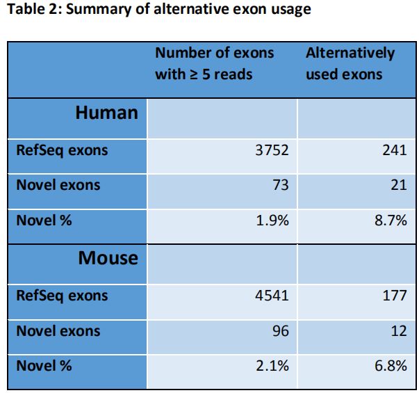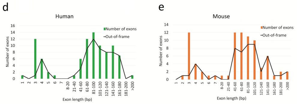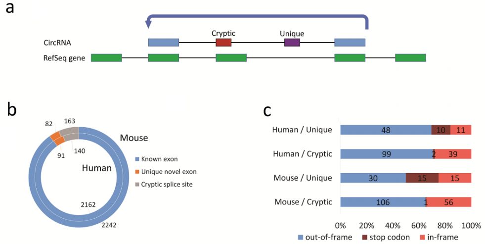 將circRNA根據新外顯子使用分類為“隱蔽的circRNA外顯子”(與注釋的外顯子共享5’或3’剪接位點)或“獨特的circRNA外顯子”(全新的外顯子)。人類2,393個外顯子中的91個和小鼠中2,487個外顯子中的82個是獨特的circRNA外顯子,140和163個分別是隱蔽的circRNA外顯子。(所有單外顯子circRNA都被排除在該分析之外,因為在單個read中需要完全覆蓋檢測到的外顯子,這對于單個外顯子circRNA而言在技術上是不可能的。)作者發現大多數獨特的circRNA外顯子在40-200bp范圍內,但也經常觀察到3-6bp的非常短的外顯子(微外顯子)組。有趣的是,大多數circRNA特異性外顯子導致移碼突變或終止密碼子獲得,可能解釋了它們在線性mRNA翻譯中缺失,因此受到無義介導降解。