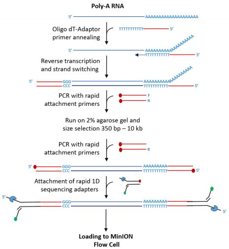將總人或小鼠腦組織RNA進行DNA酶處理并去除rRNA,然后用RNase R處理以消化線性RNA。為了進一步富集circRNA,將剩余的線性RNA多聚腺苷酸化(poly A tailing)并使用poly(A)純化磁珠去除帶polyA尾的RNA分子。收集富含circRNA的上清液并將其片段化(溫和水解切口)以使circRNA線性化。從3’末端除去磷酸基團并在線性化RNA的5’末端添加磷酸基團后,對獲得的RNA庫進行多聚腺苷酸化,以與ONT測序方案一致。接下來進行ONT全長轉錄組建庫。