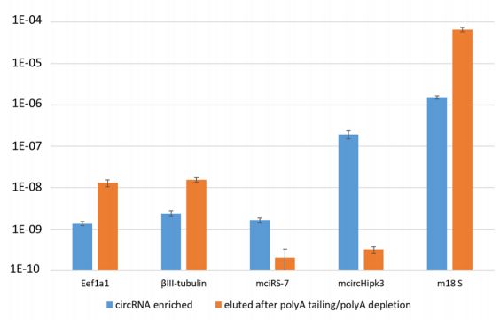 只有一小部分RNA是環狀的(例如,小鼠神經系統中去rRNA的RNA庫中僅占約0.1%)。作者采用上述方法進行circRNA-ONT測序,由于有些線性RNA分子對RNase R具有抗性,故而此方法比普通的去線性circRNA建庫多了一步:將剩余的線性RNA多聚腺苷酸化(poly A tailing)并使用poly(A)純化磁珠去除帶polyA尾的RNA分子。結果表明,該步驟使circRNA強烈富集。