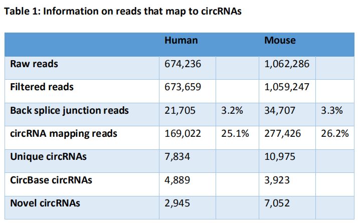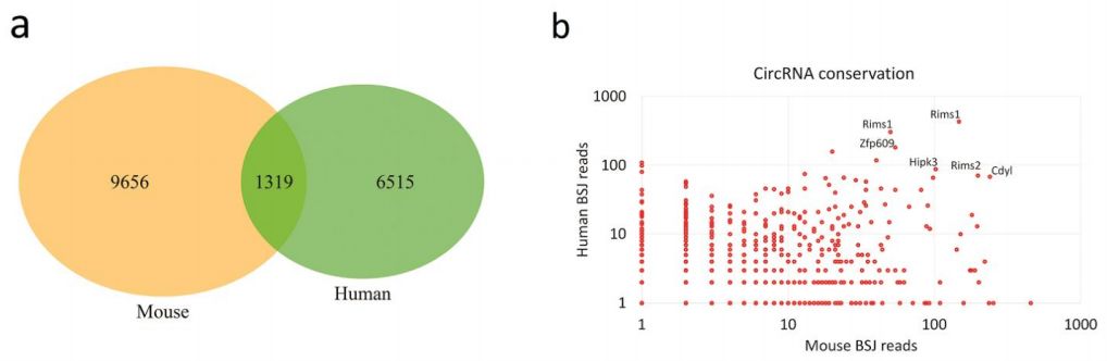 人和小鼠circRNA文庫的納米孔測序分別產生0.67M和1.06M reads,其中3.2%和3.3%跨越circRNA BSJ(Back splice junction)位點。人和小鼠中分別鑒定到7,834和10,975個circRNA,其中1,319個在人和鼠中保守的circRNA。在最高表達和保守的circRNA中,發現眾所周知的腦circRNA,例如circRims1、circRims2、circHipk3、circCdyl和circZfp609。整個數據集中,分別來自人和小鼠的2,945和7,052個circRNA先前未在circBase中注釋。