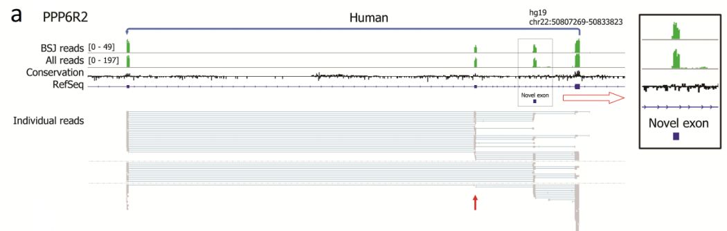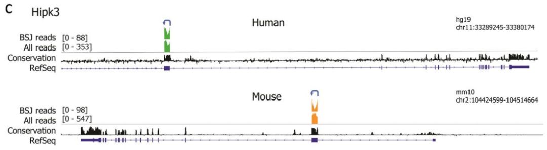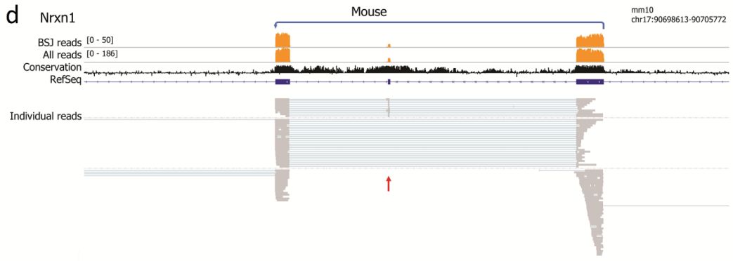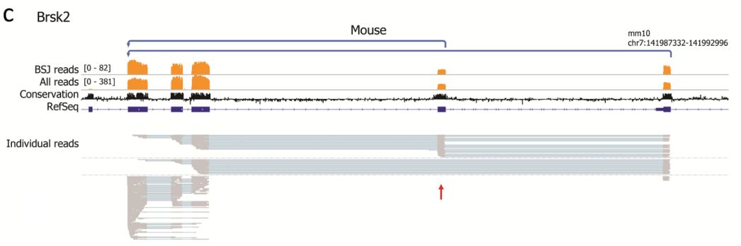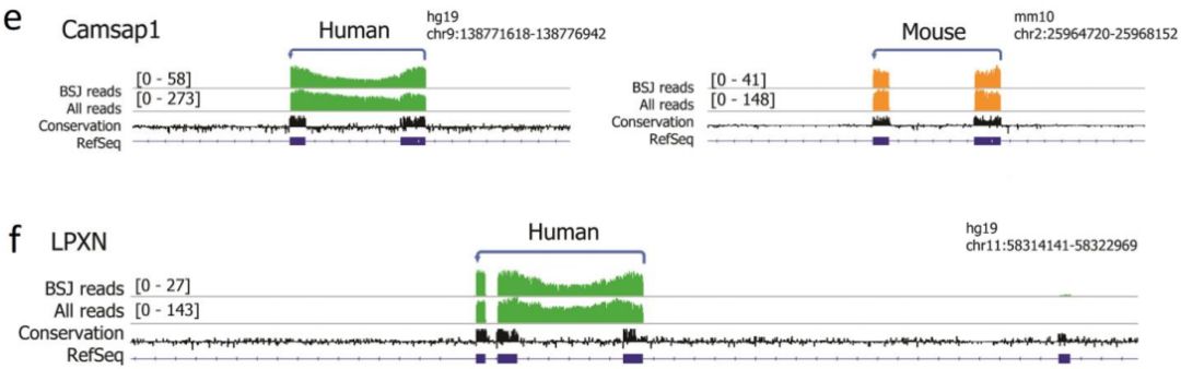 將所有小鼠和人跨越BSJ reads與各自的參考基因組比對,并定量比對到外顯子或內含子區域的堿基對的數量。為了將分析集中于更豐富的circRNA中的內含子保留和其他可變剪接事件,僅進一步研究了具有10個或更多BSJ reads并具有高于3%的平均內含子百分比的circRNA。作者發現3個人和4個小鼠circRNA具有內含子保留,而39和57個circRNA包含分別在人和小鼠的RefSeq中未注釋的外顯子序列。CAMSAP1 是circRNA內含子保留實例,其僅發生在人RNA中;LPXN circRNA是僅在人中表達的circRNA。