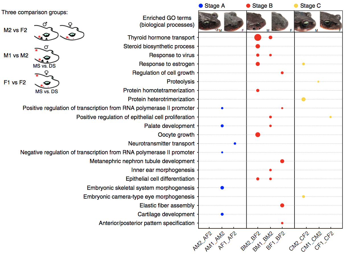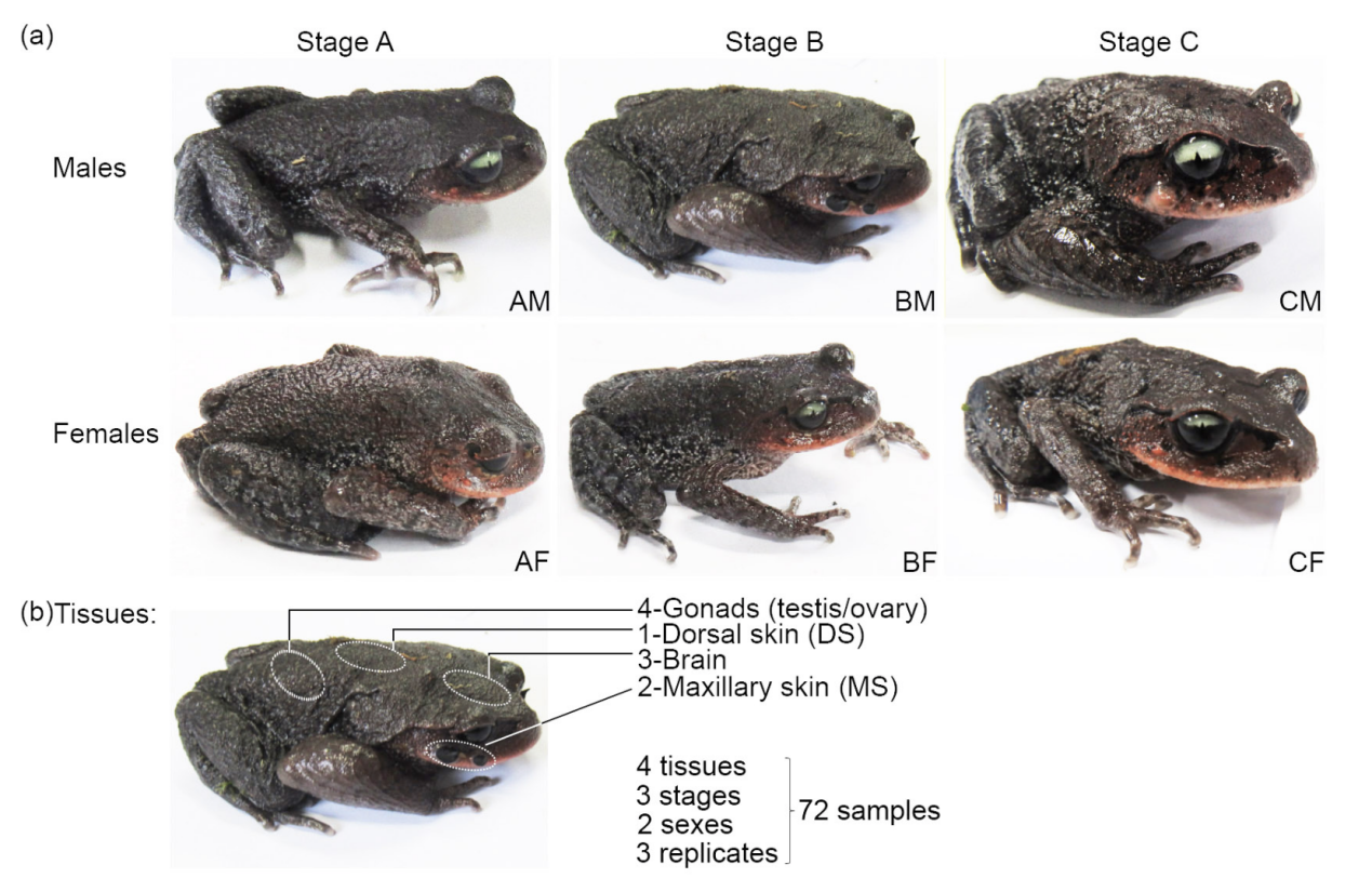 在雌雄異體的有性生物中,兩性之間在體型大小、形態(tài)結(jié)構(gòu)和功能等方面存在明顯差異的現(xiàn)象稱為性二態(tài)(Sexual dimorphism)。自然界普遍存在的性二態(tài)(如劍尾魚的劍狀尾和獅子的鬃毛等)一直是進(jìn)化生物學(xué)家關(guān)注的熱點(diǎn)問(wèn)題。兩棲動(dòng)物具有豐富的性二態(tài)特征,繁殖期的雄性雷山髭蟾在上頜的皮膚形成角質(zhì)刺,類似于人類的“胡子”,因此又被稱為“胡子蟾”,繁殖期過(guò)后,角質(zhì)刺外殼會(huì)脫落,而雌性則沒(méi)有這種特征。由于除了性染色體上的基因外,大多數(shù)的基因組在雄性和雌性之間是共享的,所以性二態(tài)往往是由基因在性別間差異性表達(dá)引起的。由于缺乏參考基因組,很少有研究能夠?qū)⑿詣e差異表達(dá)模式與特定的性二態(tài)特征聯(lián)系起來(lái),與性二態(tài)性狀相關(guān)的重要生物學(xué)過(guò)程和關(guān)鍵基因也一直難以破解。本文成功的建立了一個(gè)具有代表性的鋤足蟾亞目基因組,并對(duì)其皮膚來(lái)源的性二態(tài)性狀進(jìn)行了分子基礎(chǔ)的研究。