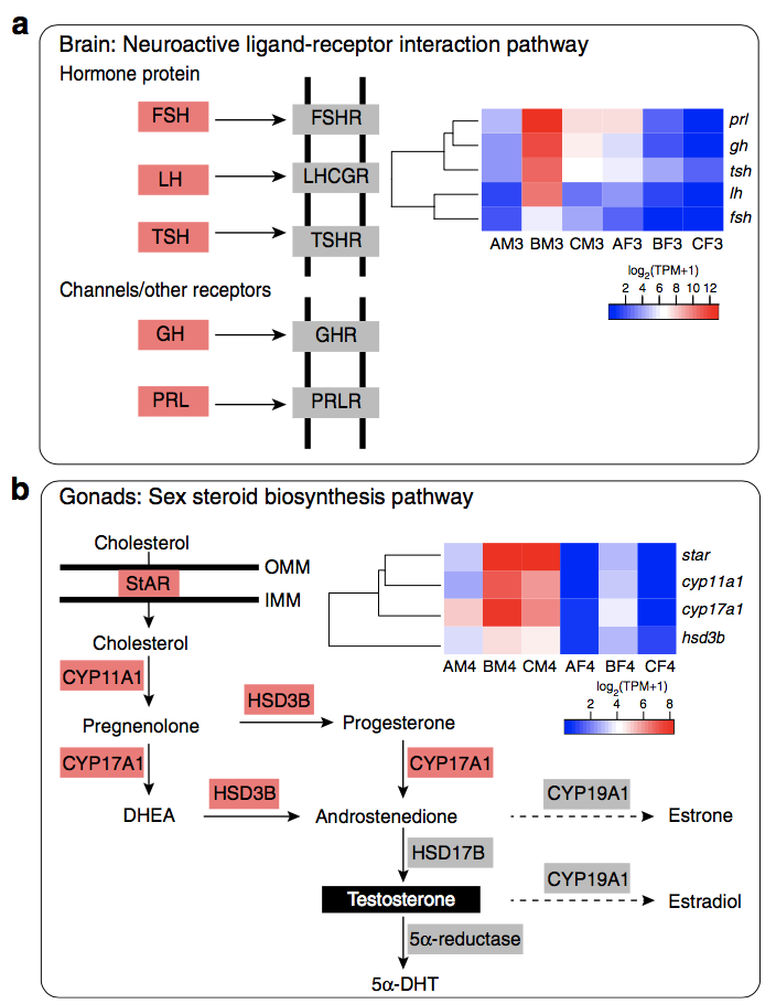 為了探討L.?leishanense中角質(zhì)刺的激素調(diào)節(jié),研究者對(duì)來(lái)自大腦和性腺的轉(zhuǎn)錄組數(shù)據(jù)進(jìn)行了測(cè)序(表2)。研究發(fā)現(xiàn)B期雄性和雌性之間的DEGs(BM3-BF3)和A期和B期雄性之間的DEGs(AM3-BM3)中的神經(jīng)活性配體-受體相互作用途徑顯著富集,在這些基因中,LH(黃體生成素)和FSH(卵泡刺激素)編碼肽激素,通過(guò)血液進(jìn)入性腺刺激類固醇激素的合成(圖9)。相關(guān)基因的表達(dá)表明雄性在繁殖季節(jié)中下丘腦-垂體-性腺軸的激活。雄性精巢在不同時(shí)期的類固醇激素生物合成途徑顯著豐富。在這條途徑中,編碼參與性類固醇生物合成的酶的基因在B期雄性精巢中高度表達(dá)(圖9),表明B期雄性精巢中雄激素(睪酮和5α-DHT)生物合成水平較高。