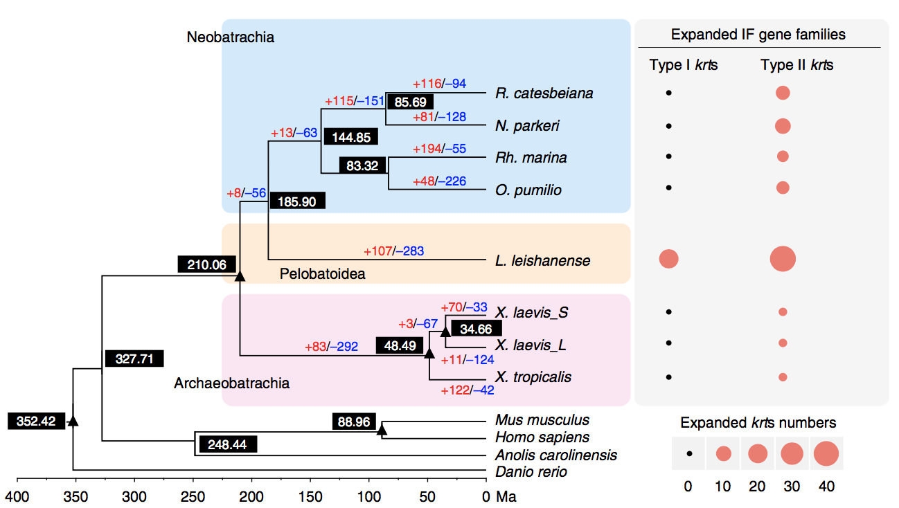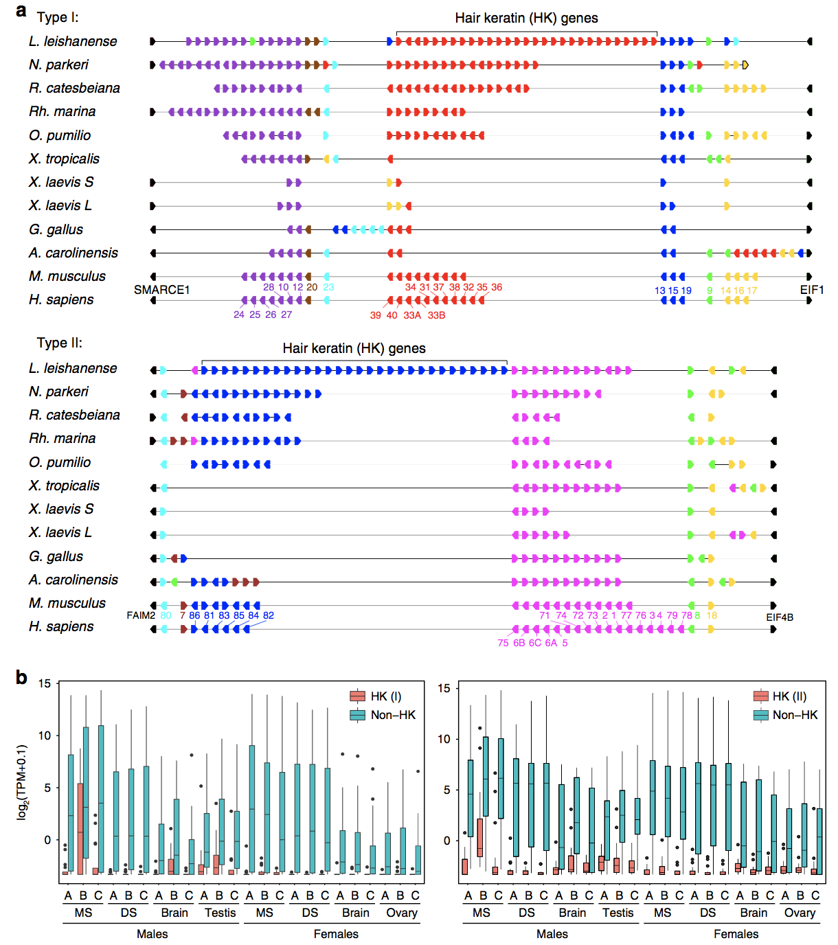 在擴(kuò)張的基因家族中,兩個(gè)編碼中間絲(Intermediate Filament, IF)蛋白的基因家族在L. leishanense基因組中顯著擴(kuò)張(圖6)。這兩種擴(kuò)張的基因家族包括編碼角蛋白的基因,角蛋白是上皮細(xì)胞的成絲蛋白,參與脊椎動(dòng)物角質(zhì)化組織的形成,如人的頭發(fā)和指甲。在哺乳動(dòng)物中,表皮堅(jiān)硬組織的一個(gè)重要組成部分是兩類α-角蛋白(稱為Ⅰ型和Ⅱ型α-角蛋白),基因組分析表明人類共有54個(gè)功能性角蛋白基因(28個(gè)Ⅰ型和26個(gè)Ⅱ型),分別聚集在兩條染色體上。在L. leishanense中,共鑒定出101個(gè)完整的α-角蛋白基因,包括53個(gè)I型和48個(gè)II型基因,這遠(yuǎn)遠(yuǎn)高于在其他物種中觀察到的此類基因的數(shù)量。通過(guò)比較α-角蛋白基因的基因組分布,發(fā)現(xiàn)Ⅰ型和Ⅱ型α-角蛋白基因分別聚集在L. leishanense的兩條染色體(Lle 12和Lle 2)上,而且側(cè)翼基因與其它脊椎動(dòng)物的基因相同,暗示角蛋白基因序列的保守性。在哺乳動(dòng)物(人和小鼠)和L. leishanense及其他無(wú)尾目動(dòng)物中,存在多個(gè)物種特異性的角蛋白基因簇,這是角蛋白基因庫(kù)擴(kuò)大的主要原因(圖7a)。L. leishanense中發(fā)生串聯(lián)復(fù)制的角蛋白基因與哺乳動(dòng)物的毛發(fā)角蛋白(Hair Keratins, HKs)同源(圖7a)。L. leishanense中HK同源基因的拷貝數(shù)幾乎是其他無(wú)尾類的兩倍(圖7a)。