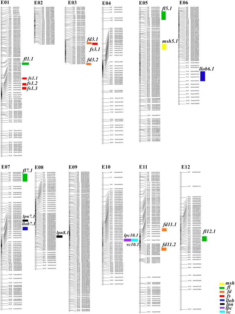 FL定位到4個QTL,即fl1.1, fl5.1, fl7.1, 與fl12.1,分別位于LG1,5,7,12上。最主效的QTL為fl12.1,可解釋24.05% 的表型變異,其次為fl1.1與fl5.1(PVE為12.00與13.06%),貢獻率最低的為fl7.1(PVE僅為4.08%),此外,在fl5.1中鑒定到11個SNPs。這4個QTLs中,除fl12.1的標記Marker8964317遠離其它兩個相鄰的標記外,其它QTL標記均處于合理的距離。