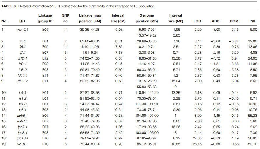 FD定位到4個QTL,分別位于LG3與11上,QTL貢獻率分別為fd3.1(11.98%)、fd3.2 (8.50%)、fd11.1 (7.95%)與fd11.2 (6.62%)。每個QTL的遺傳距離為0.15-0.68 cM.;fl12.1與fd3.2存在部分重疊,fd11.1與fd11.2分別跨越Chr11:71.47-71.87 cM and 82.29-82.98 cM。并且每個QTL包含的SNP數目為2-4個。