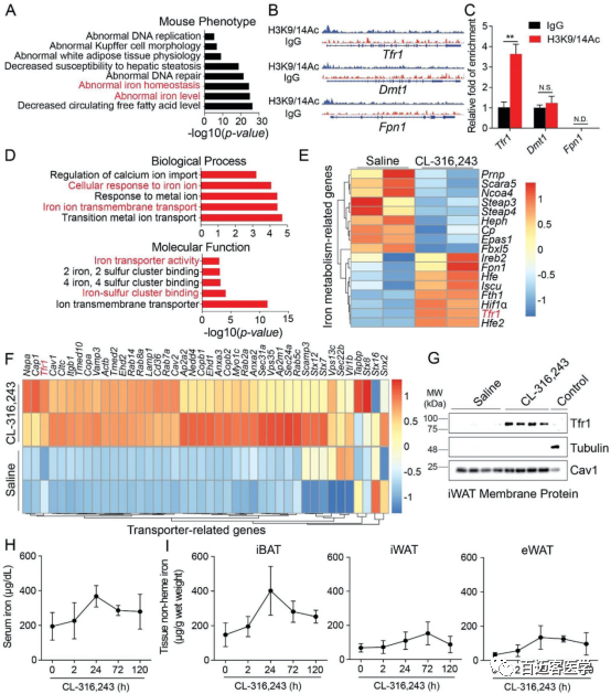 本研究首先利用Chip-seq (Fig 1A/B)、RNA-seq(Fig 1D/E)、蛋白組三種技術(shù)手段,從轉(zhuǎn)錄調(diào)控、mRNA、蛋白質(zhì)三個(gè)不同層面發(fā)現(xiàn)在實(shí)驗(yàn)組(C57BL/6J mice)中與鐵轉(zhuǎn)運(yùn)相關(guān)的啟動子 、基因、蛋白均有明顯的富集。為了驗(yàn)證結(jié)果的準(zhǔn)確性,對與鐵轉(zhuǎn)運(yùn)相關(guān)的啟動子進(jìn)行用Chip-qPCR(Fig 1C)的方法驗(yàn)證,對鐵轉(zhuǎn)運(yùn)相關(guān)的蛋白做了WB驗(yàn)證(Fig 1G),結(jié)果都顯示Tfr1基因在實(shí)驗(yàn)組(C57BL/6J mice)中的表達(dá)量明顯增加。綜上所述,Tfr1基因在CL-316,243處理的小鼠中Tfr1基因?qū)﹁F穩(wěn)態(tài)起著至關(guān)重要的作用。