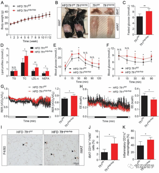 為了進(jìn)一步探究Tfr1基因在棕色/米色脂肪細(xì)胞的發(fā)育和產(chǎn)熱能力維持的過程的作用機(jī)制。分別對Tfr1Adp/Adp和Tfr1fl/fl 進(jìn)行高脂肪、正常喂養(yǎng),并對4組樣本分別進(jìn)行葡萄糖耐量、胰島素抵抗、呼吸速率、能量消耗、CD11b+F4/80巨噬細(xì)胞、CD11c+巨噬細(xì)胞的比例等實(shí)驗(yàn)。數(shù)據(jù)表明在高脂肪處理實(shí)驗(yàn)組 中,整體體重(Fig3 A)、白色脂肪組織(Fig3 B)大小都沒有明顯的差異。然而在高脂實(shí)驗(yàn)組中棕色脂肪組織完全轉(zhuǎn)化為白色脂肪組織(Fig3 B)。同時(shí)小鼠空腹血糖、血脂、非酯化脂肪酸脂肪酸的含量明顯高于高脂對照組。高脂喂養(yǎng)后,盡管血液中血糖含量沒有太大的變化,但是驗(yàn)組中葡萄糖耐量、胰島素抵抗的值都要高于高脂對照組(Fig3E/F)。這說明高脂實(shí)驗(yàn)組中糖耐受性受損可能是導(dǎo)致空腹血糖升高的原因。而呼吸速率、能量消耗的實(shí)驗(yàn)表明缺失Tfr1基因后呼吸速率會增加,能量消耗能力降低(Fig3G/H)。在正常喂養(yǎng)的實(shí)驗(yàn)組中白色脂肪組織相對于正常對照組來說明顯減少。 上述數(shù)據(jù)表明,能量消耗降低并沒有導(dǎo)致高脂喂養(yǎng)實(shí)驗(yàn)組小鼠體重增加,可能是由于Tfr1缺失對白色脂肪細(xì)胞的內(nèi)在的影響。