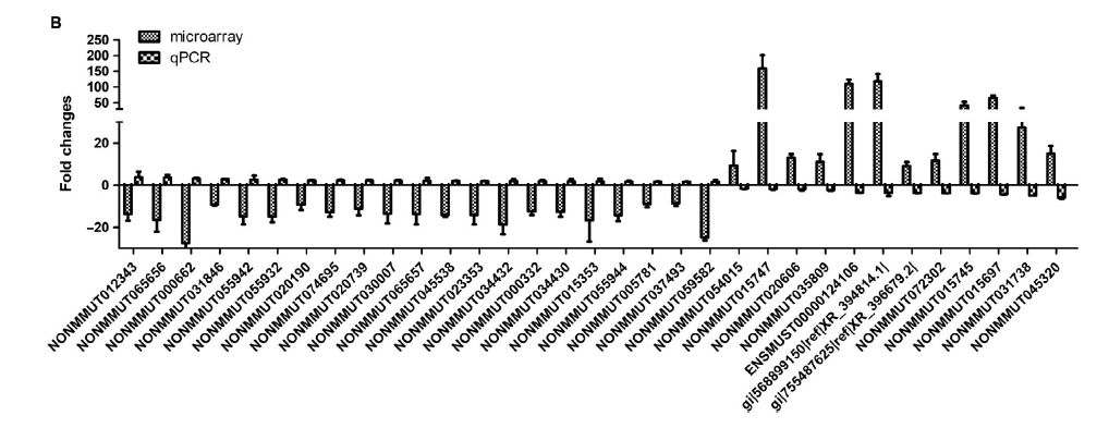 使用芯片技術檢測lncRNA,差異表達lncRNAs的散點圖和聚類圖顯示了肺腺癌和正常肺樣本之間有明顯區(qū)別(圖A、B)。重點研究了在人和鼠之間具有較高差異倍數(shù)且保守的lncRNAs,當FC>8,P<0.05時,鑒定到729個lncRNA。根據(jù)染色體位置保守性和序列保守性,篩選出210個具有潛在人類同源物的lncRNA用于后續(xù)驗證,其中129個上調(diào),81個下調(diào)(圖C、D)。根據(jù)其基因組位置,將210個lncRNA分為u(基因間)、i(內(nèi)含子)、x(反義)和o(正義重疊)四大類。已鑒定的lncRNAs大部分屬于i類,有101個(48.09%)(圖E)。