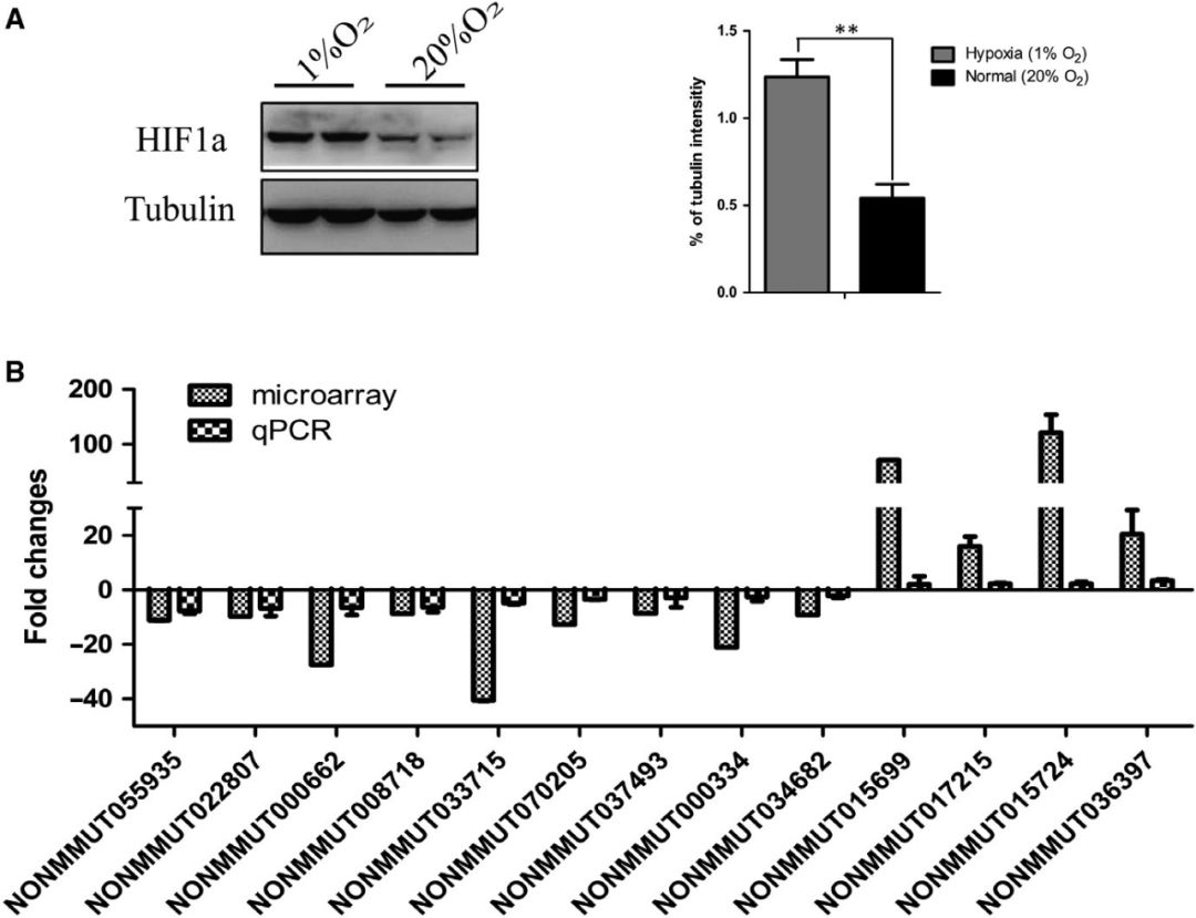 缺氧是實體腫瘤的一個顯著特征,低氧腫瘤通常對傳統(tǒng)的癌癥治療有抵抗力,且腫瘤低氧與晚期惡性腫瘤和轉(zhuǎn)移相關。作者進一步研究了低氧調(diào)節(jié)的潛在的lncRNAs。將KP細胞在常氧(20% O2)和缺氧(1% O2)中培養(yǎng)48h,WB結果顯示缺氧可有效上調(diào)KP細胞HIF1α的表達(圖A)。RT-PCR結果顯示,缺氧誘導的KP細胞中有13個lncRNAs表達下調(diào),4個lncRNAs在缺氧誘導下表達上調(diào),其表達變化方向與小鼠肺腺癌組織芯片中的表達變化方向一致(圖B)。